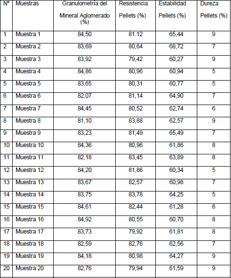 Para confirmar la dosificación correcta del cemento, se le realizaron pruebas aleatorias a la calidad de los pellets, formados en el proceso de aglomeración. Todos esos datos experimentales se exhiben a continuación.