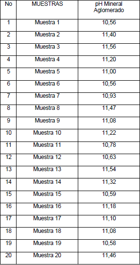 Los valores de pH del mineral aglomerado, mostrados en la tabla 2 demuestran que ha existido estabilidad, garantizando el medio básico durante las operaciones de la planta, por lo que no es la causa de los problemas en la recuperación de oro en la lixiviación.