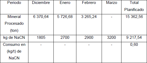 El consumo de NaCN por tonelada de mineral pasado a proceso, durante el período correspondiente a diciembre 2014 a marzo 2015 lo muestran las tablas 3 y 4.