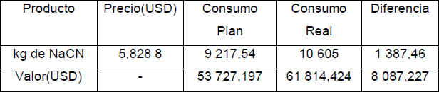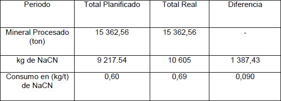 Las tablas anteriores muestran que para poder procesar lo planificado, fue necesario utilizar un sobreconsumo del cianuro necesario para efectuar la lixiviación. Fue inevitable el sobreconsumo de este reactivo hasta 0,69 kg de cianuro por tonelada de mineral pasado a proceso provocado por la alta concentración de cobre mostrada en las figuras 2 y 3, trayendo como consecuencia que se alimentaran al proceso 1,39 t de NaCN por encima del planificado así como gastos no planificado de 8 087,23 USD