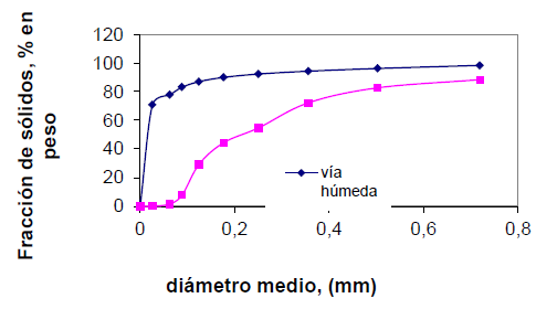 (tabla 1), se determinó la clasificación granulométrica del cieno carbonatado. Con los datos obtenidos del cribado en húmedo se comprobó que la fracción mayoritaria corresponde a las partículas finas (menores que 0,026 mm), de ahí las características plásticas que muestran las suspensiones; no siendo así para el cribado en seco, donde se puede observar que predominan partículas de mayor tamaño, producto de la formación de agregados de tamaños grandes, tal y como se muestra en la figura 1.