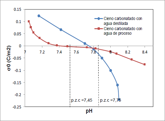4. Debido a las características coloidales de las suspensiones de cieno carbonatado, su superficie sólida se carga eléctricamente al entrar en contacto con el agua del proceso, siendo positiva la densidad de carga superficial, para valores de pH inferiores al p.z.c., y negativa para magnitudes de pH superiores a este.