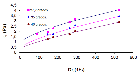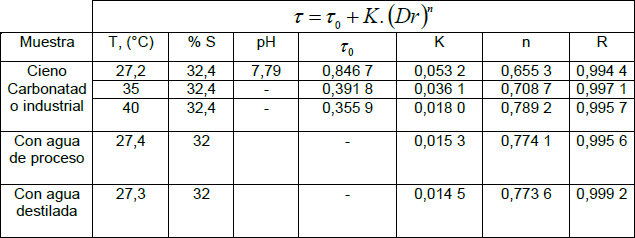 Se realizó la caracterización reológica de la muestra industrial de cieno carbonatado a diferentes temperaturas, manteniendo constante su contenido de sólidos (32,4 %), obteniéndose las curvas de flujo presentadas en la figura 3. Estas curvas fueron ajustadas al modelo reológico de Bulkley-Herschel (2):