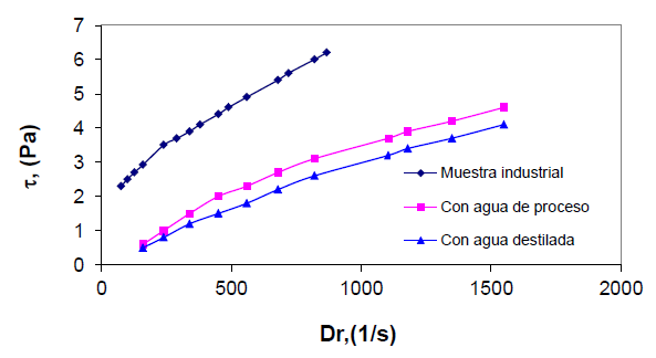 . Las pulpas industriales exhiben mayores valores de sus parámetros reológicos y de sus viscosidades, comparándolas con las preparadas en el laboratorio. Ello se debe a que las pulpas industriales poseen mayor homogeneidad y partículas más pequeñas, lo que propicia una mayor estructuración de la suspensión, y, por consiguiente, mayores valores de los esfuerzos cortantes y de sus viscosidades.