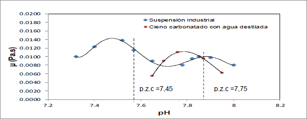 Para determinar el efecto del pH sobre la viscosidad se utilizó una pulpa industrial y otra preparada en el laboratorio con agua destilada, ambas con una concentración de 45 % en peso de sólidos. Luego, se determinaron sus viscosidades a diferentes pH, tal como se muestra en la figura 5.