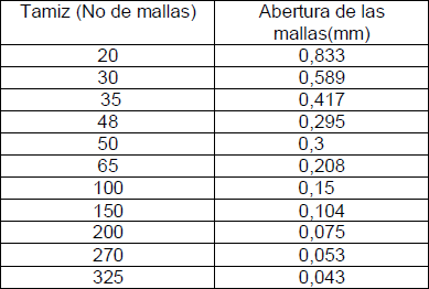 El comportamiento observado en el cribado en húmedo es el que poseen las muestras industriales, y se comprobó que la expresión (1) describe con una alta precisión los valores de la fracción de sólidos en peso, YB, en función de la correspondiente abertura del tamiz, DPB [7]: