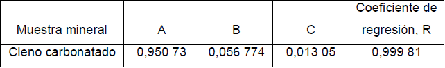 1. La fase sólida del cieno carbonatado contiene un 89,32 % de carbonato de calcio y un 10,68 % de impurezas sólidas acompañantes. El carbonato de calcio, a su vez, está constituido por dos fases mineralógicas: calcita (52,80 % en peso) y aragonito (47,20 % en peso), que muestran una buena cristalinidad.