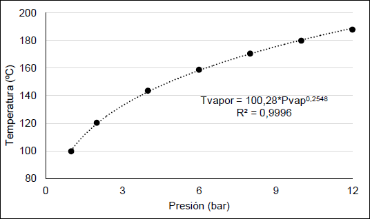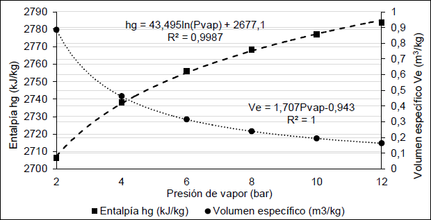Las ecuaciones planteadas fueron organizadas y combinadas en una hoja de cálculo del programa informático Excel, que combinándolas con la herramienta “solver”, permitió definir una estrategia para la realización de los cálculos. Primeramente se estableció todo el balance energético en la escala actual de 200 L, permitiendo ajustar la metodología de este tipo de esterilización. Si bien la metodología de cálculo permite estimar aspectos energéticos necesarios para el posterior escalado, también sienta las bases para realizar ajustes y estudios al sistema actual en futuros trabajos. Se debe destacar que para la realización de este trabajo fue necesario asumir algunos elementos que hoy se desconocen la nueva planta para el aumento de la escala de la producción de HeberNem. No obstante, la hoja de cálculo construida permite rectificar los cálculos de manera muy simple. Fue necesario obtener las ecuaciones que describen algunos de los datos empleados con el objetivo de automatizar lo más posible los cálculos. Tal es el caso de la entalpía de vaporización del agua y el volumen específico del vapor de agua relacionados con la presión de vapor, los cuales se muestran en la figura 1.
