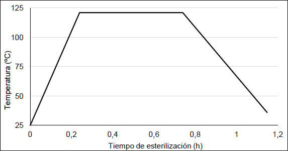 (27)Los cálculos se realizaron asumiendo las condiciones de la escala actual. El proceso de esterilización del medio de cultivo se realiza por chaqueta con un volumen de fermentación de 160 L de medio de cultivo. En la figura 5 se puede observar el perfil promedio del paso de esterilización en la máxima escala de producción actual.