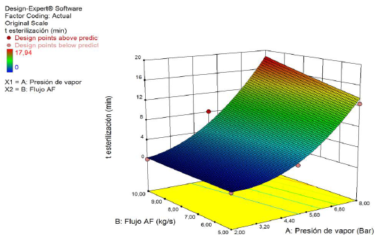 En la figura siguiente se muestra la influencia de la presión de entrada de vapor y el flujo másico de agua fría en el tiempo de esterilización. Ambos factores evaluados tienen influencia sobre el tiempo de esterilización. Dentro de los niveles evaluados se puede observar que a presiones de vapor menores de 3,6 bares la influencia de ambos factores es pequeña, incrementándose a presiones superiores. El máximo tiempo de esterilización se obtiene a una presión de vapor de 8 bares con una ligera influencia del flujo másico de agua fría. Para minimizar el riesgo de contaminación en la nueva planta de producción en China, se deben garantizar condiciones dónde se mantenga el cultivo a 121 ºC por al menos 20 min.