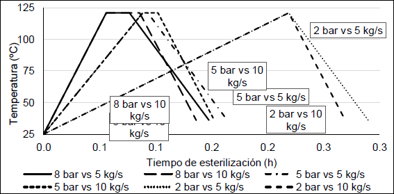 En la figura siguiente se observan los perfiles de esterilización de los puntos evaluados en la metodología de esterilización por inyección de vapor directo. Esta figura se construyó con los resultados graficados en las superficies de respuesta (ver, ¡Error! No se encuentra el origen de la referencia., 7 y 8). El perfil de esterilización obtenido para las variantes con 2 bar de presión de entrada de vapor muestran tiempos de calentamiento superiores a las 2 h. Con este tiempo de calentamiento el estrés térmico es igual a 105,12 ºC*h, lo que representa un 136,6 % del estrés térmico total que se necesita para la suma de los tres pasos involucrados (calentamiento, esterilización y enfriamiento). Se puede apreciar que las endientes en el perfil de calentamiento presentan una diferencia considerable en el área bajo la curva.