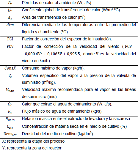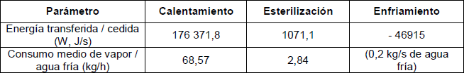 Durante la etapa de enfriamiento no se consume vapor, el valor reportado en la tabla corresponde al flujo másico del agua de enfriamiento. El balance energético permitió calcular parámetros físicos del sistema actual y compararlos con los reales. Primeramente el resultado del cálculo teórico del diámetro interno de la tubería de entrada de vapor fue igual a 2,33 cm, siendo el real de 2,5 cm. Este resultado es dependiente del consumo máximo de vapor en la etapa de calentamiento (medio de cultivo, material del tanque y pérdidas del fermentador) igual a 164,2 kg de vapor por hora. Se puede observar que el diámetro de la tubería calculado es inferior al real, este comportamiento puede ser motivo de la aproximación en el coeficiente global de transferencia de calor y las necesidades energéticas de las líneas expuestas del fermentador. Sin embargo este resultado no supone ningún inconveniente. En segundo elemento calculado fue el área necesaria para el calentamiento del medio de cultivo igual a 1,848 m2, siendo la real igual a 1,85 m2. Este resultado se considera favorable y permite concluir que la metodología presenta un elevado nivel de exactitud.