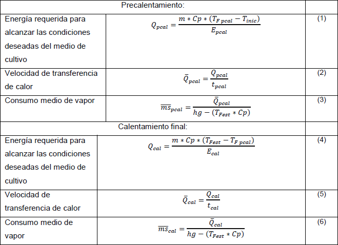 Teniendo en cuenta que la temperatura de esterilización en ambos métodos será de 121 ºC esta metodología permitirá igualar el estrés térmico en ambas escalas y garantizará que el medio de cultivo tenga iguales características al finalizar la esterilización. La mayoría de las ecuaciones que se emplearán en la metodología de cálculo son ecuaciones clásicas de transferencia de calor, en algunos pasos son mezcladas para lograr mayor exactitud. El resto de las ecuaciones se encuentran disponibles en la página web de Spirax-Sarco [11] en forma de gráficos y tablas, en los cuales puntos experimentales o valores se ajustarán a comportamientos para obtener la ecuación del comportamiento.
