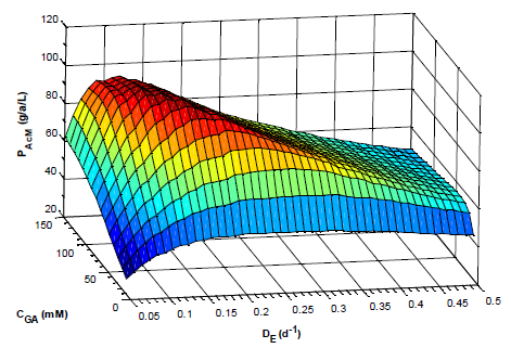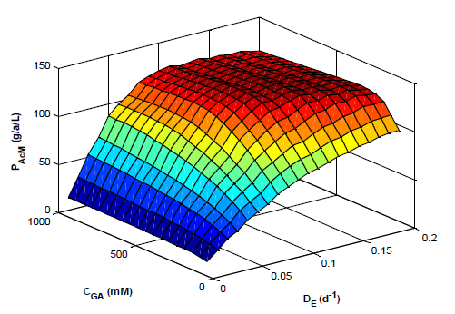 Para esta variante se determinó que la máxima productividad en la síntesis de AcM que se alcanza es de 101,45 g año-1 .-1, para un valor de D. igual a 0,1355 d-1 y una CGA igual a 88,01 mM, (Fig. 1). Se observa que en la región cercana al óptimo la sensibilidad para ambas variables es significativa. Las condiciones óptimas referidas para este caso permitirán comparar este sistema de cultivo con el de doble etapa.