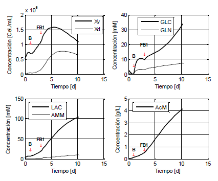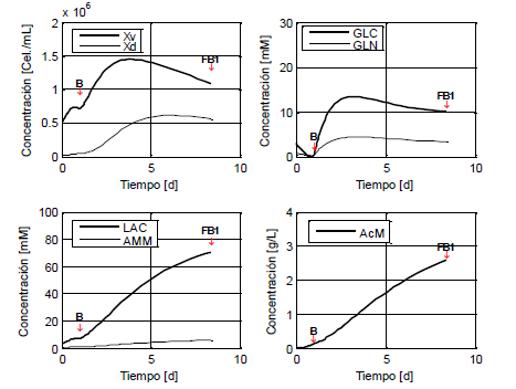 GLCf- Concentración de glucosa en el alimentado (mM) GLNf- Concentración de glutamina en el alimentado (mM) LAC- Concentración de lactato (mM)