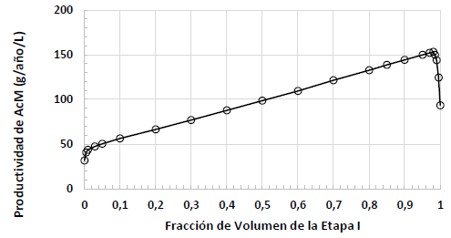 En el caso de la variante de dos etapas, una variable muy importante es la fracción del volumen total del fermentador que sería destinada a cada etapa. Es por eso que se realizó el diseño óptimo de la operación variando la fracción de volumen de la primera etapa en el rango de 0 a 1. La Fig. 3 evidencia que en la mayor parte de su intervalo, el aumento de esta variable produce una dependencia monótona creciente en la productividad. En los extremos, sin embargo, la productividad decrece bruscamente, sobre todo en el extremo superior. Este resultado resultó inicialmente sorprendente.