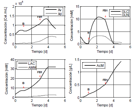 En busca de evidencias para explicar este comportamiento fue construida la Fig. 4, que contiene los perfiles de concentración de las diferentes variables para una fV igual a la unidad. Esto quiere decir que la primera etapa fue fed- batch y que la segunda etapa fue discontinua (batch), o sea, no se alimentan nutrientes. Este sería un caso extremo, próximo al estado en el que ocurre la inflexión en los extremos de la Fig. 3, cuando fV es casi la unidad. Nótese en la Fig. 3 cómo, al comenzar la segunda etapa, las concentraciones de glucosa y glutamina caen bruscamente. En estas condiciones la concentración de biomasa viable es cercana a 1,2 x 106 células/mL, lo que produce una demanda de nutrientes que no se puede satisfacer ante una baja disponibilidad de nutrientes en el tiempo restante. De aquí que los resultados en el extremo derecho de la Fig. 3 se deben al desequilibrio que tal extremo genera entre demanda de nutrientes y su disponibilidad.