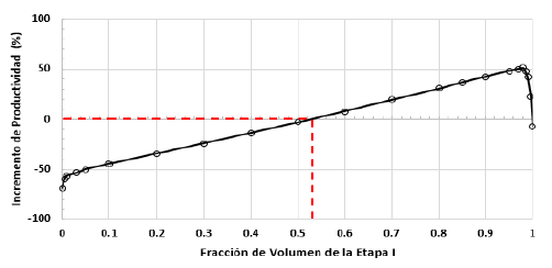 Al calcular el aumento relativo de la productividad del cultivo en simple y en doble etapa (Fig.5) en función de la fracción de volumen fV, se observa que para valores menores de 0,53 no se consigue un efecto positivo, o sea, no existe superioridad de la segunda variante.