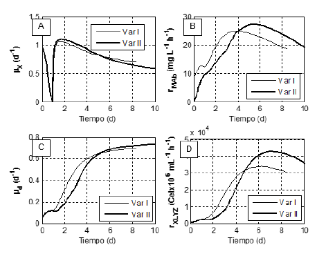 La Fig. 8 contiene las evidencias que explican las causas de los mejores resultados obtenidos en la optimización y la coincidencia con lo antes predicho [15]. En la variante II, la velocidad específica de crecimiento (Fig. 8A) es superior en su primera etapa, situada entre el tercero y el quinto día, comparada con el sistema de simple etapa (variante I). Esto explica por qué se alcanza una mayor concentración de biomasa en esta primera etapa que la conseguida en todo el sistema de simple etapa.