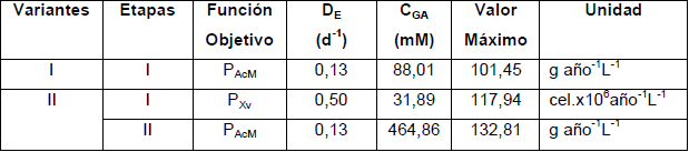 Nótese las diferencias en las velocidades de dilución estática de la variante de dos etapas. Estas diferencias se deben a la función objetivo que fue utilizada para diseñarlas. Cuando la función objetivo fue maximizar la productividad de AcM, el valor de D. debe ser 0,13 d-1, sin importar el tipo de sistema de contacto. Sin embargo, cuando el objetivo es maximizar la productividad en biomasa, DE debe ser de 0,5 d-1. Este resultado coincide con las predicciones realizadas por los autores en el trabajo anterior [18]: altas velocidades de dilución favorecen la formación de biomasa y bajas favorecerán la producción del AcM.