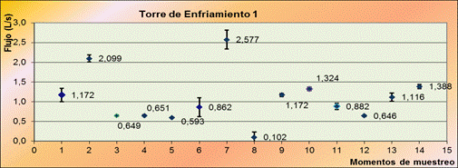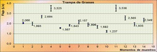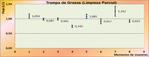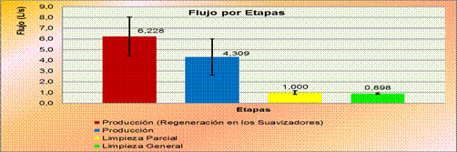 En la figura 1 se muestran los valores de flujo promedio obtenidos solamente en la etapa de producción, ya que en la limpieza parcial y general el flujo de residual está vinculado a la línea de Refinación por tanto solo es apreciable para la Trampa de Grasa. En esta figura se representa el valor de flujo promedio ubicado a la derecha del punto, ya sea en la parte inferior o superior del mismo, también se muestra la desviación que presentan estos valores en forma de barras.