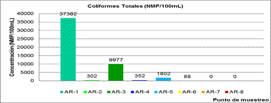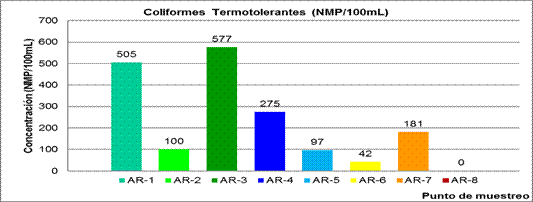 Los puntos de muestreo AR-1 y AR-3 son los únicos que poseen valores promedio por encima de lo especificado en las normas tomadas como referencias (NC 27:2012 y NC 521:2007) 8,9. Esto ocurre porque al AR-1 van a para todas las descargas de los lavaderos y baños, mientras que en AR-3 esto se manifiesta por la disposición de suciedad y varios componentes del proceso productivo que son arrastrados por los conductos hacia este sitio. A lo anterior se suman los altos niveles de DBO5 permitiendo el desarrollo poblacional de coliformes.