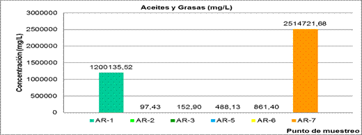 Como es de esperar en la Empresa Refinadora de Aceite los residuales de esta entidad tiene un elevado contenido de aceites y grasa, principalmente en AR-7 (Línea de llenado) debido al derrame que ocurre en la máquina para el llenado de los pomos. Mientras que en AR-1 la concentración de este parámetro disminuye porque se le unen otros residuales provenientes de otras fuentes generadoras que presentan un bajo contenido de aceite y grasa. Ver figura 12
