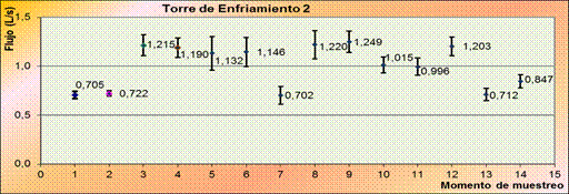 Mediante el registro de los valores de tiempo para determinar el valor del flujo promedio, se obtuvo como resultado el flujo por momentos de muestreos. En el primero con 2,065 L/s que varía dentro de un rango de ± 0,091 L/s y el segundo con 1,992 L/s con una variación de ± 0,164 L/s. Ver figura 4.