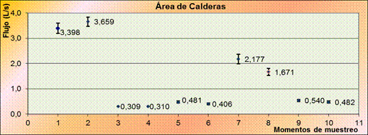 El área de calderas contribuye al flujo total de residual de la planta durante el tiempo de regeneración con un valor de 1,919 L/s, oscilando en un rango de 1,810 y 2,027L/s. El flujo de este punto equivale a 6,908 m3/h con una variación de ±0,389m3/h.