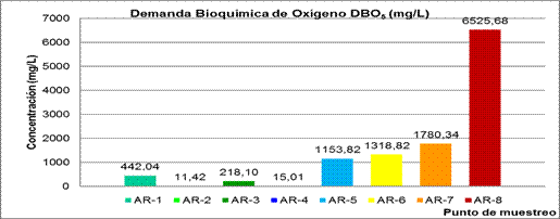 El 75 % de los puntos de muestreo están por encima de los límites permisibles debido a que hay grandes cantidades de materias susceptibles de ser degradadas u oxidadas por agentes biológicos. Se obtuvieron valores por debajo de 60 mg/L solamente en los puntos AR-2 (Torre de enfriamiento 2) con 11,42 mg/L y AR-4 (Área de calderas) con 15,01 mg/L, mientras que en el resto de los puntos están por encima del valor permitido con 158,01 unidades.