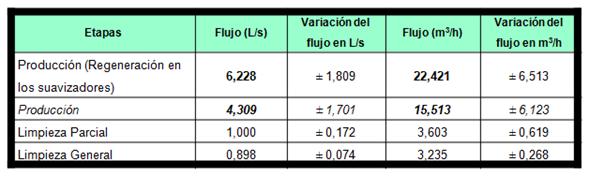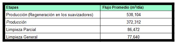 El máximo valor generado en la fábrica por un día es en la etapa de producción con regeneración de suavizadores, con un total de 538,104 m3/día. El menor valor se produce durante la Limpieza General con 77,640 m3/día. En la tabla 2 se refleja el flujo promedio de residuales generados en cada etapa por día.
