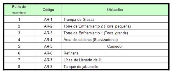 Se determinaron ocho puntos para la toma de muestras, ubicados en las fuentes de origen del residual y el trayecto del sistema de evacuación. Las precisiones para la ubicación estuvieron en función del resultado de las entrevistas realizadas a los especialistas de la planta, lo que permitió identificarlos (ver tabla 3) como: