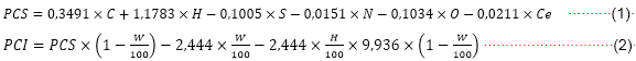 C, H, N, O y Ce es el contenido de carbono, hidrógeno, nitrógeno, oxígeno y cenizas respectivamente, W es la humedad, expresadas en por ciento peso base seca.