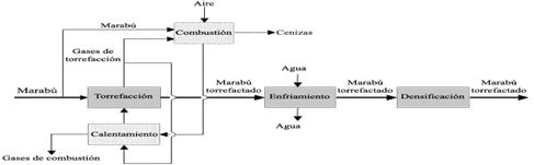 El marabú (11 % de humedad) procedente de la fuente de abasto es alimentado a un reactor de lecho fluidizado tipo torrefactor, donde se produce la descomposición y depolimerización de la lignina, celulosa y hemicelulosa. El torrefactor debe operar en ausencia de oxígeno a una temperatura de 250 °C, durante 1 h. El aumento de la temperatura del marabú se alcanza por contacto directo con una corriente de gases calientes efluentes de la propia etapa, los cuales se llevan a la temperatura deseada por intercambio con los gases provenientes de la combustión de marabú. Esta es un sistema auxiliar que contribuye a elevar la eficiencia energética del proceso.