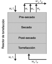 Torrefacción: en el diseño del torrefactor se siguió la metodología planteada por /6/. Para un mejor estudio de los fenómenos que ocurren en la etapa de torrefacción se divide el reactor en cuatro sectores: pre-secado, evaporación, post-secado y torrefacción, como se muestra en la (Fig 2).