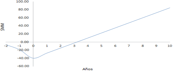 Con el cálculo de los indicadores dinámicos se valida la factibilidad económica de la propuesta en estudio. El Valor Actual Neto (VAN) es de $ 4,94E+07 con una Tasa Interna de Retorno (TIR) del 58% y un Plazo de Recuperación al Descontado (PRD) de 3,20 años, como se muestra en la Fig. 3.