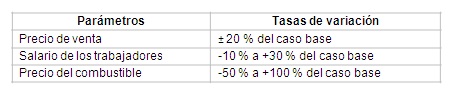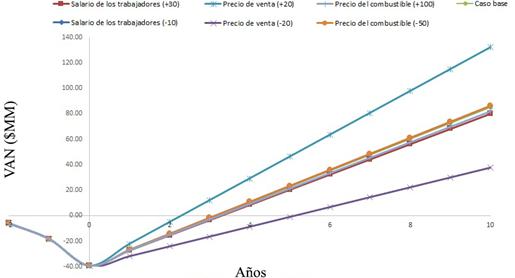 El análisis de sensibilidad del VAN se realiza considerando: costo del combustible, salario de los trabajadores y precio de venta del producto. La selección de los parámetros se justifica por la variabilidad de los precios del diésel en el mercado internacional, la política económica actual del pago por resultados (en función de la productividad), así como la novedad del producto en el mercado cubano, lo cual condiciona el precio de venta en correspondencia a la asimilación de la tecnología y su demanda. Se determinaron los valores extremos de estos parámetros en correspondencia con las tasas reportadas en la tabla 13. 10