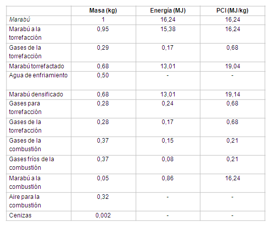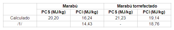 En la tabla 1 se muestran los resultados del PCS y PCI del marabú tanto a la entrada como a la salida de la planta de torrefacción. Son incluidos para la discusión los reportados en la literatura para iguales condiciones geográficas.1)