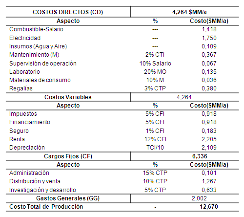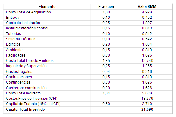 Los elementos de costo considerados para determinar el CTD y el CTI que tributan al Costo Fijo de Inversión (CFI) se desglosan en la tabla 8, ascendiendo este a $ 2,10E+07.