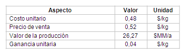 P- los kilogramos de pelets torrefactados. Tomando en cuenta los gastos que se incurrirían para una posible importación de este producto por concepto de transportación, impuestos y almacenaje, los costos se incrementarían alcanzando 0,55 $/kg, justificándose económicamente la propuesta. Como se muestra en la tabla 12 se obtiene una ganancia unitaria de 0,04 $/kg para un total de 2,04E+06 $/a, lo cual evidencia la factibilidad económica.
