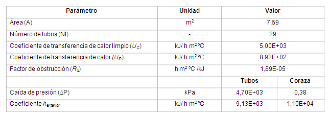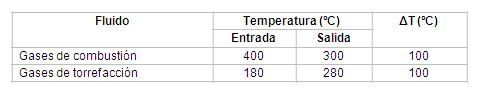 Para el diseño del intercambiador de calor se determina la cantidad de calor transferida en la etapa para elevar la temperatura de los gases de la torrefacción desde 180 a 280 ºC. Se dispone que el flujo proveniente de la torrefacción de marabú se hace circular por el interior de los tubos y los de la combustión por la coraza. En la Tabla 4 y 5 se relacionan las temperaturas de ambos flujos con su diferencia de temperatura (ΔT) y los parámetros de diseño del intercambiador de calor, respectivamente.