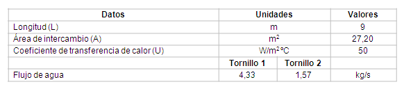 Con el objetivo de disminuir la temperatura de los pelets torrefactados (inferior a los 100 ºC) para evitar la autocombustión, se deben acoplar dos tornillos sinfín en serie. El flujo de agua necesario para el enfriamiento es determinado en correspondencia, los cuales se muestran en la tabla 6.