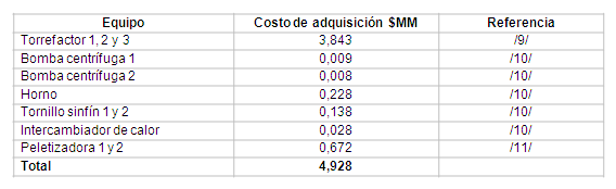 Los costos de electricidad del proceso por diferentes conceptos se resumen en la tabla 10 y fueron determinados a partir de índices de consumo reportados en la literatura, obteniéndose un consumo total de 6,88E-02 kWh/kg de pelets torrefactados y un costo total de 1,75E+05 $/a, considerando el valor reportado por (8) para el precio de la electricidad autogenerada (0,05 $/kWh).