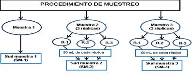 Procedimiento de muestreo para la caracterización físico-química a la fase agua oleosa. Una primera sudmuestra (SM-1) perteneciente a la muestra 1, una segunda sudmuestra perteneciente a la fase agua muestra 2 (SM-2) formada por 50 ml de cada una de las réplicas y una tercera sudmuestra (SM-3) perteneciente a la fase agua muestra 3 formada por 50 ml de cada una de las réplicas. Ver figura 2.