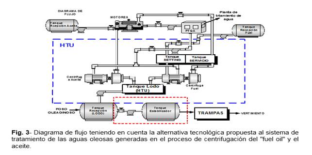 En la figura 3 se muestra el diagrama de flujo con la alternativa tecnológica propuesta al sistema de tratamiento de las aguas oleosas (lodo), generadas en el proceso de centrifugación del "fuel oil" y el aceite.