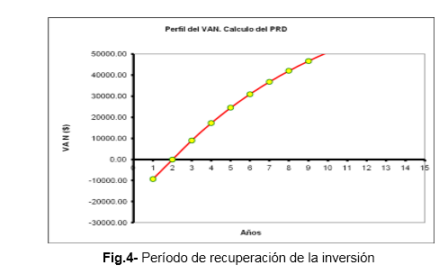 Según los valores obtenidos para el Valor Actual Neto (VAN) de $65,659.51 y una Tasa Interna de Rentabilidad (TIR) de 64% la mejora propuesta resulta ser viable desde el punto de vista económico. Según se muestra en la figura 4, el período de recuperación de la inversión (PRD) es de aproximadamente 2 años, después de implementada la propuesta.