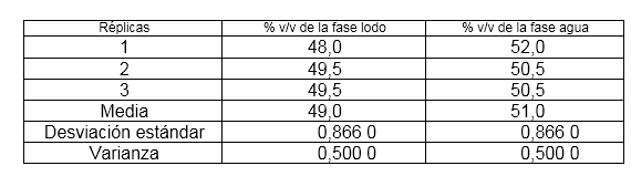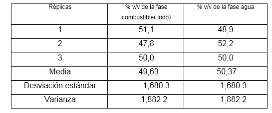 En la tabla 2 se observa que el residual posee valores medios de 49,63 % v/v de fasea c9ombustible (lodo) y 50,37 % v/v de fase agua. Los resultados estadísticos reportados demuestran, que no es significativa la dispersión porque, no existe diferencia en las varianzas.