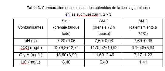 En la tabla 3 se observa que con solo 72 h de reposo (SM-2), en la fase gua oleosa se evidencia una disminución de un 25,2% en el contaminante grasa y aceites (G y A) y de un 23,8 % en el contaminante hidrocarburo (HC), pero poco significativo en el contaminante Demanda Química de Oxigeno (DQO), si se comparan con los resultados obtenidos en la SM-1. Esto está dado porque en el tanque de recepción de agua oleosa total (lodo) no existe una buena separación, debido a que cada 24 h el agua oleosa total (lodo) del tanque de lodo del HTU es enviada al mismo, provocando revolturas en el seno del líquido. La diferencia en el parámetro pH no es significativa.