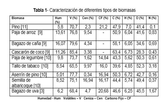En la tabla 1 se presenta la caracterización de diferentes tipos de biomasa