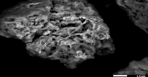 Para completar la información sobre la efectividad de la tecnología de columna, en la remoción de cromo en los licores residuales de fibrocemento, se realizó un estudio por MEB de la zeolita empleada. La figura 7 muestra la micrografía de una partícula de 10 µm de la ZN, con posterioridad al tratamiento realizado al licor residual. En la figura se observan modificaciones superficiales atribuibles a especies adsorbidas, como consecuencia del contacto del mineral con el licor residual. Esta suposición se confirmó realizando un análisis por espectroscopia dispersiva de Rayos-x (EDX) en algunas zonas de la partícula, marcadas en la figura con una esfera. La figura 8 es el resultado del análisis realizado por EDX, al punto E1 de la figura 7, y revela la presencia de cromo, y otros elementos contenidos en el licor residual.